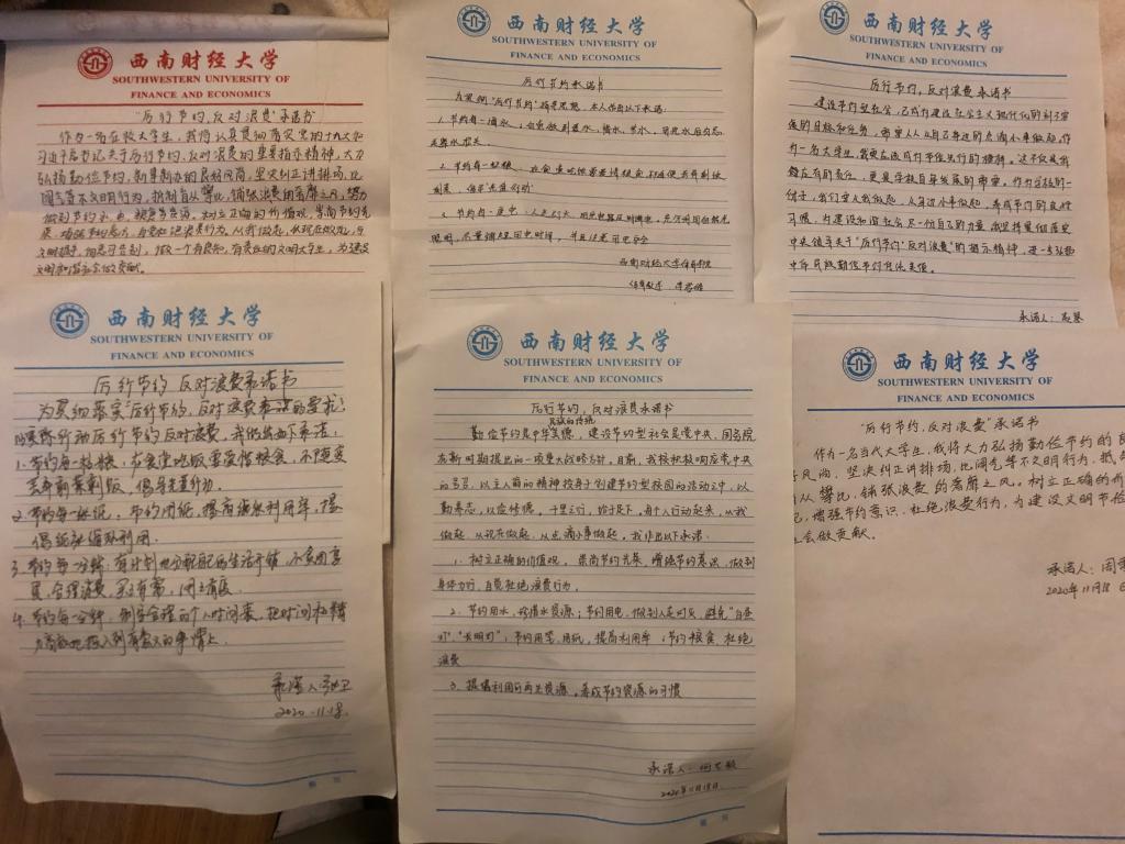 会上,胡相伟带领全体同学深入学习了习近平总书记关于厉行节约、反对浪费的重要指示精神。会议详细阐述厉行节约、反对浪费是中华民族的优秀传统美德,是我们在长期生活实践中形成的光荣传统,是习近平总书记对全社会倡导的时代新风。随后,参会人员通过观看央视视频“厉行节约 反对浪费 从你我做起”,巩固主题学习,深化自身认识。李君皓、张卫等同学围绕会议主题就自身实际出发进行了交流发言,指出大学生应该将“厉行节约 反对浪费”观念落实到日常行为中去,例如食堂吃饭光盘、寝室循环用水、随手关灯关电等。此次活动同学们还通过书写“厉行节约 反对浪费”承诺书,把感悟写在纸上、记在心中、行在生活中。最后,谢老师总结了本次会议,分享自己对于主题的感悟,殷切希望同学们能够增强厉行节约、反对浪费的思想觉悟。