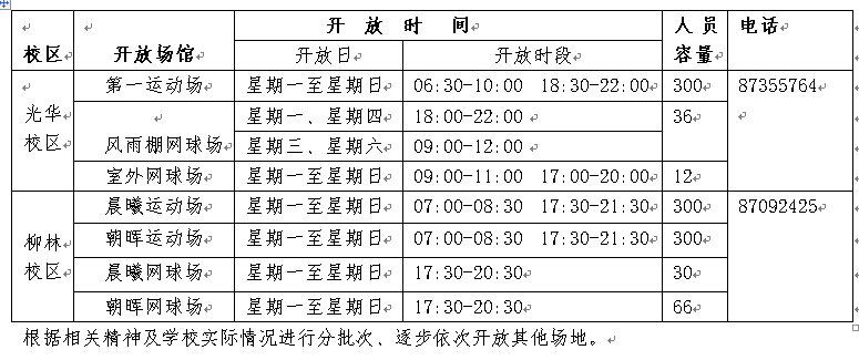 为认真贯彻落实学校新冠疫情防控领导小组工作部署,满足我校师生员工体育锻炼需求,按照国家、教育部、教育厅关于学生返校工作相关要求,参考其他兄弟院校的体育场馆开放办法,本着科学防控、精准施策、“减少人员聚集”、严防体育场集聚性风险原则,经学院研究制定本管理办法。稳妥有序开放光华、柳林两校区部分运动场、风雨棚网球场、室外网球场等通风效果好、方便人流管控的体育场所,暂不开放室内场馆、有身体接触和对抗激烈的集体性运动场地(含篮球、足球等)以及游泳池等。