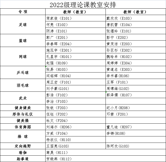 各学院: 经教务处同意,本学期2022级本科生第1周体育课为体育教学理论课,9月5日起恢复户外教学。根据教室资源状况,现将理论课具体安排通知如下: