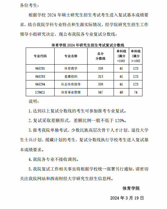星空(中国)关于公布 2024 年硕士研究生招生考试复试分数线的通知